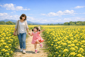 この図は、少女がお母さんと菜の花畑にきている様子を表しています。Copilotに描いてもらいました。少女はとても楽しそうです。少女、お母さん、菜の花畑、青い空、こうした登場人物は勿論アクターです。他にも、今日ここにくることを待ち望んでいた少女の気持ち、良い天気で気持ちの良い暖かさ、広々とした感じ、お母さんと手をつないた安心感、親子の日常的な関係性、お花畑のイマージュ、こうした全てがアクターネットワークを形成し、この少女のうれしそうな行為に繋がっています。これら全てがアクターです。