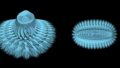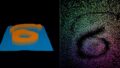左側の立体画像を作製する際に、砂を除いた部分を白として取り出し、trace SOPで3D空間に移したことを述べました。今回、この後に上述した粒子を放出するプログラム部分を付けています。できた映像を次に示します。