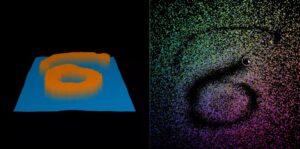 「復元がある場合の砂の動き」の例では、砂を除いた部分が立体として浮かび上がる映像と、この動画のようにオブジェクトを放出するような映像が作れました。これらが「我」に対応しており、原理としての「梵」が、「復元がる場合の砂の動き」となります。2種類の全く違った「表れ」があるわけですが、それは衝突した部分をよけるという、同じものから生成されたものです。
