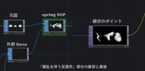 右側が「擾乱を伴う反復系」で作製した線状のポイントの集まりです。これは最初だけ元図が必要で、spring SOPにフィードバックを含む複数のforceを作用させることで動きを作ります。その最初の図が左側です。元図はトーラスと円筒を組み合わせた3つの部分からなっています。線状のポイントに3つの塊があるのは、この元図を反映しているからです。次の画像が放出させる部分の中心部分のプログラムです。