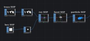 particle SOPを使って放出しますが、線状のポイントはTOPですのでこれをtrace SOPによって3D化します。次々と放出させる映像を作るための仕組みはray SOPとparticle SOPの組み合わせで作ります。第1インレットにtrace SOPを、そして第2インレットに立方体を入力しています。この立方体はグルグル回転しています。ray SOPはなかなか使いでのあるオペレータです。これまでもポテンシャルの凸の表示を作るために使ってきました。原理は同じですが、今回は使い方が違います。ray SOPは第1インレットの入力を第2インレットの表面に投射し、その表面の画像を出力します。投射する方向は第1インレットから入力されたポイントの法線方向です。ray SOPの設定で立方体にぶつかった投射は、今回の場合は設定により7回反射を繰り返します。反射は物理法則に従います。立方体は回転しているので、どのように反射するかは原理的には線形動作ですが、見た目ではもはや複雑すぎて追っていくことはできません。投射を繰り返す度に、表面でできた画像を出力します。これによって複雑な形状が次々と生成されます。2025.09.06のblogに「線形操作で生じる予測不可能性」を書いていますが、このray SOPを使って多重反射させる方法も「線形操作で生じる予測不可能性」に当たると考えます。次にfacet SOPについて述べます。これは無くてもparticle SOPにつなげることはできますが、particleを放出する方向を決めるために使います。facet SOPはpointで構成される面に対して法線方向を定める働きです。particleの方向を整えたことになります。その後paricle SOPによって、ポイントから粒子を放出させています。perticle SOPの続きを次に示します。