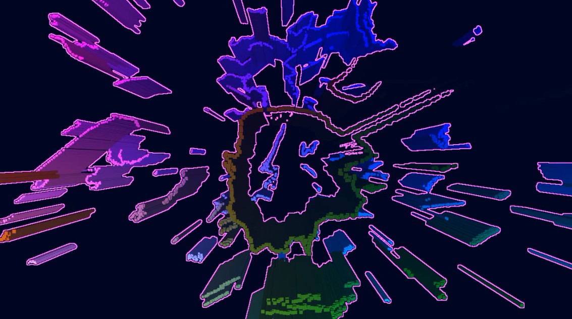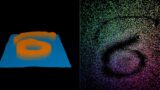 「復元がある場合の砂の動き」の例では、砂を除いた部分が立体として浮かび上がる映像と、この動画のようにオブジェクトを放出するような映像が作れました。これらが「我」に対応しており、原理としての「梵」が、「復元がる場合の砂の動き」となります。2種類の全く違った「表れ」があるわけですが、それは衝突した部分をよけるという、同じものから生成されたものです。