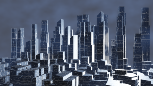 これは、blenderのジオメトリーノードの練習として作製した都市の画像です。「https://www.youtube.com/watch?v=MXz5JL9bqQo」を真似ています。