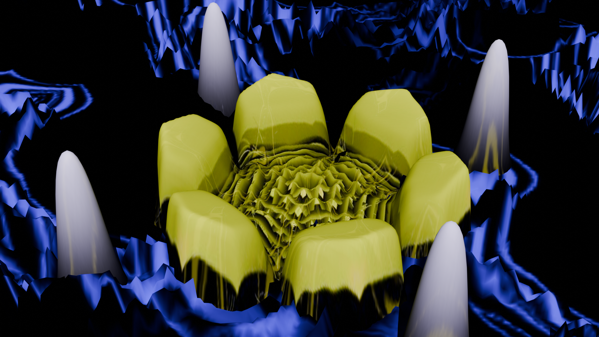 この画像は2025.09.06のblog「線形操作で生じる予測不可能性」で示したTouchDesignerで作製した画像を、blenderのディスプレイスメントモディファイアの使って作製した画像です。「線形操作で生じる予測不可能性」のblogも是非参考にしてください。TouchDesignerでは立体を作製し、それを真下から見ることで平面の画像を得ました。そしてblenderで平面になったその画像をディスプレイスメントで上側に持ち上げて作製しました。TouchDesignerの画像とblender後の画像も随分と印象が違います。