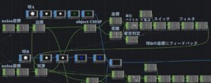 この図で重要なのはobject CHOPです。これは便利なCHOPで入力したCHOP間の差のベクトルと距離を求めてくれます。つまりA-Bのベクトルです。これを距離で割ったものが単位ベクトルになります。これの符号を反対にし0.2倍しています。これが移動させるベクトルです。この値を球Bの座標にフィードバックして加えます。objedt CHOPから距離を求めているので、これが2r以下になるかどうかで衝突判定をします。衝突した場合はスイッチを切り替えて、移動させるベクトルを球Bへフィードバックさせます。衝突していないときは(0, 0, 0)のベクトルをフィードバックしています。