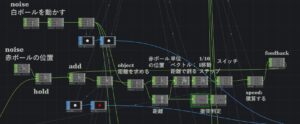 白いボールを動かすためにnoise CHOPで(x,y,z)の座標を作っています。衝突対象を赤いボールで説明します。赤いボールの位置もnoise CHOPで作っています。hold CHOPを使って固定しています。周期的なパルスによって、位置が周期的に変わります。holdの次のaddはmath CHOPです。これは衝突して求める移動量を元の座標に加える部分です。移動量を求めてaddするというのが、基本的な構造です。addした座標が赤いボールの座標になります。次に移動量をどうして求めるかを述べます。object CHOPという便利なオペレータがあります。これは2つの入力座標をA, BとするとA-Bベクトルと2つの座標の距離を求めます。勿論math CHOPで計算することもできます。object CHOPで求めた値を、ベクトルと距離に分けて、ベクトルを距離で割って単位ベクトルを求めます。この方向に赤いボールを動かします。動かし方には幾つか考えることができます。ここではspeed CHOPを使う方法を述べます。speedチョップは積算して値を求めるのに便利なCHOPです。衝突に対して少しずつ移動させるために、0.1を掛けています。フィードバックを続けることで0.1ステップで赤いボールを動かします。衝突しているのかどうかを判定する必要があります。距離からexpress CHOPで判定しています。これは2つのボールの距離がそれぞれの半径を足した値以下になれば衝突したとして1を出し、衝突しない場合は0を出力するようにします。この出力でスイッチを切り替えています。衝突していないときはconstant CHOPからの0の値が加わります。衝突している間は単位ベクトルの0.1倍が加わります。この値はspeedによって積算されて行きます。衝突していないときは0をが積算されるので移動量はかわりません。衝突している間は単位ベクトルの0.1倍が積算されていきます。これが移動量ですので、feedback CHOPでフィードバックできるようにして、これをaddしています。speedはholdにパルスが加わるタイミングでリセットして、赤、青、黄色の初期値が変わるタイミングでゼロにします。赤のボールについて説明しましたが、同様なことを青、黄色についても行っています。移動量を求めてそれを衝突している期間フィードバックして加えるという方法は衝突問題の基本です。