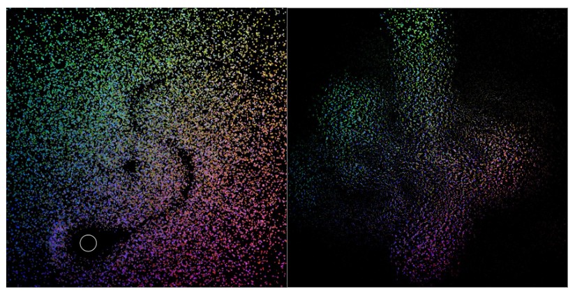 映像が左右あるのは、3次元の衝突ですので、1つの画面では奥行に対して衝突しているのか・衝突していないのか、わからないので2つの画面を並べて表示しました。同じモノを180度違った2つのカメラで見ています。