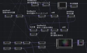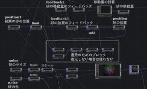 上の部分が、衝突に対する移動量を求め、砂の位置を計算する部分です。中間にある、復元のためのブロックは今は使いません。下のブロックは絵を描くためのブロックになります。砂の絵の描き方は、砂の位置を決め(右側のposition 砂の位置)、砂のサイズをnoise TOPでランダムにインスタンシング、また色もnoise TOPでランダムにインスタンシングすることで作製します。