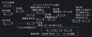 「マウスの位置」と書いた部分はconstant TOPによって作製しています。砂の位置との間でベクトル計算をするので、これに合わせます。ですのでconstant TOPのResolutionは(32768, 1)にしています。Pixcel Formatも32-bit float(RG)に合わせます。panel CHOPから得るマウスの位置は0~1の値になるので、-0.5~0.5になるように、x,yの値を変換します(-0.5引けばよい)、それをconstant TOPのcolorr, colorgに使います。全てのベクトルにマウスの座標を入れるということです。これと砂の位置を引き算します。これがマウスの位置と全ての砂の位置との差を求めたことになります。math TOPを使って距離を求めます。引き算したベクトルを距離で割って、単位ベクトルを求めます。ここで注意するのはマウス位置から砂の位置を引いて作製したベクトルですので、これはマウス位置の方向へ動くベクトルになっています。動かすのは砂側ですので、後でマイナスを掛けて方向を反転する必要があります。一方で砂の半径とマウスの半径を足し算しています。これは砂とマウスが接した時の距離です。そして距離同士を引き算します。衝突した場合はマウスの位置と砂の位置の差はマウスの半径と砂の半径を足したものより小さくなるので、この引き算は衝突していると負になります。この引き算にどれぐらいの距離を一回の計算で動かすかをかけで移動量を求めます。例えば0.1を掛けるとかです。そしてこれを単位ベクトルと掛け算します。これにより移動量がベクトルになります。この時衝突していたら負になっていることを思い出していただくと、移動量は単位ベクトルと逆の方向になり、これで砂が移動する方向になっています。ここで重要なのは、掛け算して得た移動量をベクトル化した値は、衝突していない位置のベクトル計算も入っているということです。砂を移動させたいのは、マウスと衝突した砂だけですので、衝突した砂は移動量を出力し、衝突していない砂は移動量をゼロにする必要があります。これが「衝突判定」部分です。この求め方はかなりクレバーです。まず引き算した(衝突していると負になる)出力をmath TOPでIntegerをFloorにします。Floorというのは、実数に対して自身以下の最大の整数を出力することです。例えば0.3は0になります。また-0.3は-1になります。ここで、引き算(衝突していると負になる)のところを見てください。マウスの位置と砂の位置は-0.5~0.5なので、最大の離れた場合はマウス(-0.5, 0.5)で砂が(0.5,-0.5)の位置のように対角に来る場合です。この時長さはルート2の1.414になります。これからマウスのと砂の半径を足した値を引くので、1.幾らというのが最大です。たいていは1より小さくなります。また衝突した場合は負になります、これは勿論-1より大きい値です。ですので、これのFloorをとると、衝突した値は-0.幾らですので、-1になります。そして衝突していない場合の大半は1より小さいですので、0になります。そして僅かながら対角にくるような関係の場合は1を超えるので、1になります。この後-1を掛けます。すると、衝突した場合は-1でしたので1になります。大多数の衝突していない場合は0のままです。そして少ないながら対角の関係となった場合は-1になります。その後limitでclampの最小を0最大を1に設定すると、衝突した場合は1となり、衝突しなかった大多数は0のまま、そして対角にあった関係は-1でしたので0にClampされます。この結果衝突した場合は1、衝突していない場合は0となります。これを移動量をベクトル化したものと掛け算すると、衝突したものだけがその値を残し、衝突していない場合はゼロになります。これがフィードバックされる量になります。TOPはCHOPと違ってexpression CHOPやobject CHOP, speed CHOPに対応するオペレータがありません。そこで工夫が必要となります。今回の衝突反転の部分はその典型だと思います。なかなか思いつきません。