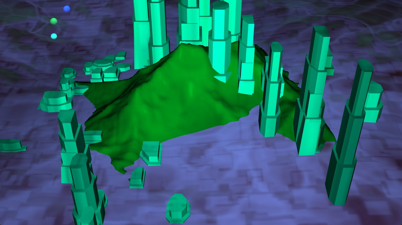 3体の球の動きと、大地, 海, 都市とは本来何の関係もありませんが、距離のパラメータで結び関係付けているのが、プロシージャル「創発的関係」です。3体の球の動きに同期して、3つのオブジェクトが上下に動き、位置関係が常に変化していきます。緑の球と白の球の距離が大地の動きに対応し、緑の球と青の球と距離が海の動きに対応、青の球と白の球の距離が都市の動きに対応しています。