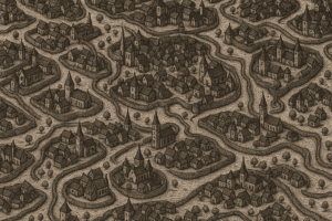 パラメータ調整していると、次第に都市と道を空想するようになりました。これが分節したということです。そこで、AIに島の所を都市にして、都市を繋いでいる所を道、あるいは城壁にして描いてもらったのが次の画像でした(2025.10.08のblog「人の痕跡」)。