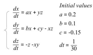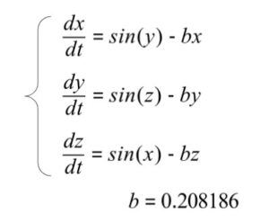 形状が複雑なので、見る角度によって印象は大きく違います。ストレンジアトラクターからは、(a,a,a)と(-a,-a,-a)付くに近に引き寄せるアトラクター的な状態があり、吸い込んでは吐き出すように見えます。そして特徴的なのは、領域が2つに分離しており、互いに行き来は無い構造です。これはb=0.208の場合です。bの値がこれより僅かに低いと2つの領域は結合し、行き来があるように見えます。二つの領域が空間的に分離している状態から結合するのは神秘的です。近い内に粒子の移動経路を追っかけてみたいと思っています。またこの微分方程式はbの値を変えると様々な形状になります。このプログラムの全体は次です。