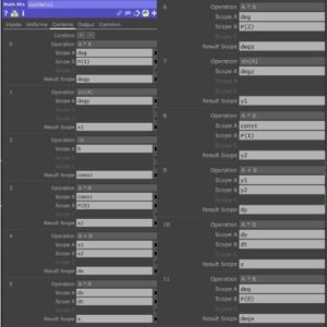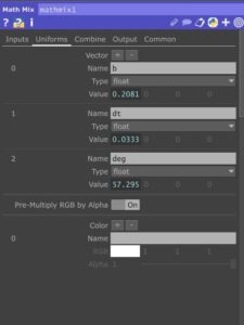 後半はgeoとrenderのいつもの組み合わせです。微分方程式を解いているのは前半です。point generator POPでポイントを発生させて、それをフィードバック系で動きを更新しています。計算式を入れるのがmath mix POPです。それではパラメータを見ていただきましょう。定数の設定はuniformのタブで行います。
