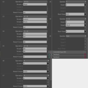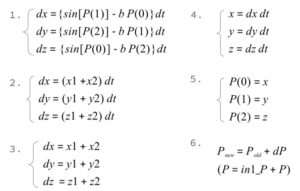 式を追っていって引っかかる点は、2.と4.の違いです。式だけをみると、dxdtはdxになるはずですが、x=dxdtにしています。これは、6.を見ていただくと、Poldに相当する計算はオペレータのフィードパックによって戻されるものです。実際に計算しているのはdPに相当しています。しかしx,y,z平面に表すには位置にしないといけないので、P(0), P(1), P(2)にしないといけません。これはx, y, zなわけです。このため、4.でx, y, zとしています。math mix POPの式だけで完結しているのではなく、オペレータのフィードバックと合わせて計算しているために、このようにしなければなりません。これを理解すると式を細かくして書いているにすぎません。GLSLでは直接微分方程式を書くので、math mix POPを使うメリットはないかもしれません。しかし全てオペレータで書こうとする人にはこれは大変便利です。