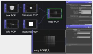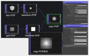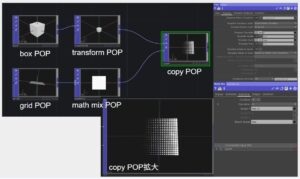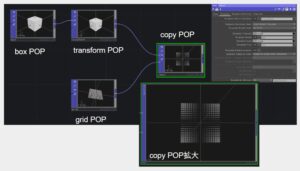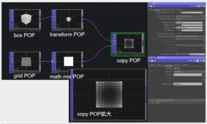 次にscleが0~1となるようにTex座標を使ってみました。grid POPの後に、math mix POPを使い、ここでTex座標に変換しています。Copy POPでTemplate Scale をTexにしています。左下が0に右上が1になるようにboxがCopyされています。