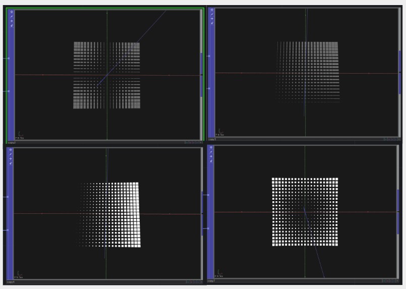 つまり場が表示できたのです。boxをcopyする際にスケールとして座標の値を使うことを指定しています。例えば(0, 0.1)ではboxのx方向には0を掛け、y方向には0.1を掛けるわけですから、大きさは見えなくなります。(0.1, 0.1)ではboxも縦横に0.1を掛けるわけですので、非常に小さくなります。このようなことが全体に行われています。マイナスの方向はscaleですから関係なく絶対値を取っているのでしょう。つまり座標があることで、それをscaleとして使うと、場が可視化できたということです。これは「モノの形状が作る場・・・」の時に使った、TorusやSphereと言った形状(空間の幾何学的性質)も媒質の性質も必要なく、場が在ることを示しています。試してみると当然なわけですが驚きです。