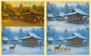 上の4枚の絵は、滋賀県の御神神社に行った時の写真をAIに見せ、AIが作製した絵です。写真は秋の時期で、1番目はそれをそのまま絵に変えてもらいました。2番目は、冬になった場合を想像して描いてもらいました。3番目は、そこに鹿が表れた場合を描いてもらいました。4番目は、一年後、子供を連れた鹿が表れた場面を描いてもらいました。この4枚の絵で「持続」を表現しようと思ったのです。4枚の絵、秋の神社、冬の神社、親鹿の訪れ、そして子鹿たちとともに戻ってきた風景、それらを並べることで、時間がただ過ぎるのではなく、重なり合い、深まり、記憶として定着していく様子が見えてくると思います。ベルグソンの「持続」はこういったことだと思っています。それぞれの瞬間が独立しているのではなく、前の瞬間を内包しながら、新たな「今」が立ち上がります。そしてこのつらなりが、時間の経過だけでなく、意味を作っています。この関係は音楽も同じです。