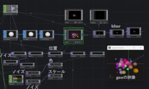 「geoの映像」と書いている部分をみていただくと、形の変形した球の集まりです。これが生物の元の形です。位置もサイズも色もランダムになっています。これは、sphere SOPをノイズで動かしたものに、位置、色、スケールのインスタンシングによって作製しています。位置、色、スケールもnoise TOPを使ってばらばらな値を与えています。noiseを使うと、-1~1, あるいは0~1のランダムな値を、設定した分解能の数だけ作ることができます。これまでにも説明してきた、値を色として設定する方法です。細かい話ですが、noise TOPのoffsetとPixcel Formatの設定には注意が必要です。位置設定のように、r, g, bに-1~1の範囲にしたい場合は、Pixel Formatを32-bit floatもしくは16-bit floatにし、offsetを0にして基準を0にします。一方、色やスケールはマイナスの値が必要ありません。この場合はPixel FormatをUse inputか8-bit fixedを使います。これらはマイナスの値を持っていません。そしてoffsetを0.5に設定します。geoをrender TOPで取り出しblur TOPでぼやかしています。その後の処理が次です。