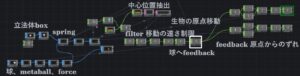 spring SOPとfeedback CHOPを使う構成です。spring SOPは外部から3種類のforceを加えて移動させることができます。立方体であるbox SOPを動かします、spring SOPではforceが働くため、設定した立方体の形状は崩れます、このため何でもいいわけですが、簡単な形状である立方体を使いました。spring SOPで崩れた立方体を構成するポイントの平均位置が結局、生物の位置になります。ですので、立方体の崩れた図形をどう動かすかという問題にすり替わっています。spring SOPのforceの一つは、餌の平均位置に移動させる力です。これが最も優先されます。揺らぎを作るのが、他のfroceとfeedbackコントロールです。spring SOPにはTurbulenceという乱流のパラメータがあります。これに値を入れて乱流を加えます。もう一つのforceは、立方体の崩れた図形の中心位置が原点からずれていくわけですが、これを原点に戻す力を作用させます。これを図中の「feedback原点からのずれ」の部分で作っています。餌が消えた場合に原点位置にゆっくりと移動する力です。常時働いているので。餌の平均位置に移動させる力より弱くしています。もう一つfeedbackがあります。立方体の崩れた形状の中心位置をfilterでディレイさせて求めます。これはゆっくりと移動させるためです。最終の出力(生物の原点移動)は、図中の白の四角い正方形で囲った部分になります。これを、spring SOPの球の位置にfeedbackしています。この球にはmetaball, forceの設定を加えることで、立方体の崩れた図形と球とは相互作用します。これによって、崩れた立方体の形がさらに変形されます。このため中心位置も変化します。このfeedbackによっても揺らぎができます。これらによって、餌に多い場所に揺らぎながら移動します。