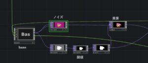 baseと書いた部分は先ほどのプログラム部分です。noise TOPですが、両方の入力に入れています。下のインレットにいれると、入力の形がnoise TOPに入ってきます。noise TOPで作った色がそれにかぶさります。この時RGBをinput+noiseにします。この設定で色が変わります。これでようやく、生物の形ができました。nosie TOPは様々に使える優れたオペレータですが、できることが多いので、扱いが難しいです。この後、バックグランドを黒にして図形だけを浮かび上がらせる処理をします。これは頻繁に使います。図形の形状(この場合はnoise TOP)に対して、閾値を使って図形の部分を白、バックグランドを黒にします。今回は閾値を2回使って段階的に処理しています。これらをcomposite TOPで乗算することで、図形だけを取り出せます。