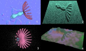 今回の「ナラティブ・パッケージ」に使う映像を作っていきます。これらは素材に対応しています。まず一つは、先回の粒子化したヒドラの映像です。再録致します。