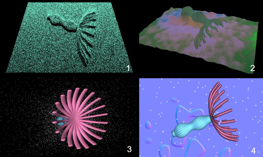 今回の「ナラティブ・パッケージ」に使う映像を作っていきます。これらは素材に対応しています。まず一つは、先回の粒子化したヒドラの映像です。再録致します。