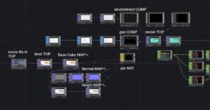 構成自体は「相対的:フォーカスとフィルタの考察」と同じです。違っているのは、movie file in TOPとなっている映像ファイル部分が、以前はbase COMPを使い、その中にL-systemで作った植物のプログラムが入っていました。そして「相対的:フォーカスとフィルタの考察」ではlevel TOPは初期値のままでしたが、今回はパラメータを調整し色を変えています。これはBase Color MAPが変わるだけでなく、Normal MAP, Height MAPも変わります。特にHeigh MAPの白黒パターンの変化は、凸凹を大きく変えます。色が白になるにつれて立体的に浮かび上がります。camera COMPのProjectionパラメータをOrthographicにして正射投影(物体を平行に投射する方法)を使ってます。これはmoviefilein TOPの平面映像をgrid SOPの平面に投射するためです。それでは元の映像と作製した映像を見ていただきましょう。元の映像です。