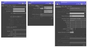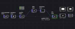 これはPOPを使ったスタンダードなプログラムです。point generator POPは平面にpointを設定しparticle POPでそのポイントからパーティクルが放出されます。ここからが重要です。particle POPからfeild POP, transferm POPをつなぎ、それをparticle POPにフィードバックしています。このフードバックのネットワークで勾配の動きを作っています。勾配は微分方程式等では差分を使いますが、フィードバックのネットワークで作る点が特徴的です。field POPとtransfer POPのパラメータを次に示します。