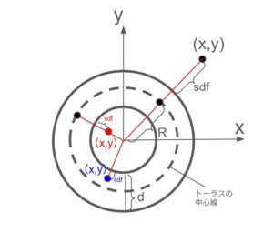 このトーラスの表面からの距離SDFを考えてみます。簡単のためz=0の平面の場合を考えてみます。トーラスの中心までの距離をR、直径をdとします。すると次の図のような位置があることが分かります。