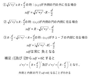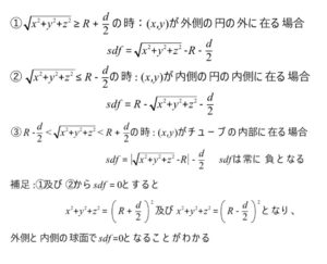 即ち、(x,y)がトーラスの外側の円の外に在る場合、ドーナツの穴に相当する内側の円の中に在る場合、そしてトーラスのチューブの中に在る場合です。トーラスのSDFはトーラスの表面からの距離を指します。上の図ではそれぞれ色をわけて示しています。トーラスのチューブの中の(x,y)が在る場合は、トーラスの中心線より内側か外側かがあるように思いますが、それは直ぐに示しますが絶対値を取ります。こうすることで区別がなくなります。それでは表面からの距離を求めてみましょう。図を見ながら追っていただくと、次の式になることが分かると思います。