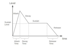 最初に変調方法について述べます、ノイズを使って音を鳴らす鳴らさないという状態をつくります。例えば鳴らすが1で、ならさないが0です。これとホワイトノイズを掛け算します。すると急に音が入るので、フィルタを入れてゆっくりと立ち上がり、立ち下がるようにします。この前後で再度変調します。変調の仕方も様々ありますが、基本的なアプローチとしてADSRの形状で変調する方法があります。ADSRはシンセサイザーではエンベロープと言われています。次の図はADSRの説明図です。
