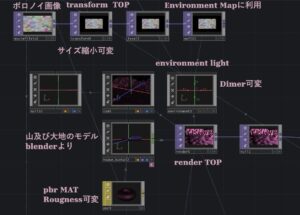 山と大地及び家のモデルはblenderで作製し、fbxファイルでTouchdesignerに持ってきています。environment lightを利用してボロノイの画像をテクスチャーとして、山及び大地に貼り付けています。画面が暗い時から明るい時にかけて、ボロノイ画像のサイズをtransform TOPを用いて小さい状況から元のサイズに可変しています。この画像をenvironment lightのEnvironment Mapに使いました。これがテクスチャーを使ったシェーダー的な効果を生みます。Environmet Mapは空間全体を包む光の背景として働きます。そこに貼られた画像が小さくなると、周囲に黒(光の無い領域)が広がるため、結果として環境光が弱まり、陰影が強調されます。つまりテクスチャーを加工したことで、空間のライティングが変化したことになります。光の当て方を計算するのは通常はpbrのようなシェーダーですが、今回はenvironment lightがその役割を果たしたことになります。この方法によって大きく画面の陰影が変わりました。この他にも全体を明るくするために、environment lightのDimerのパラメータを変化させています。明るくするに従って大きくしています。また、質感を変えるためにpbr MATのRoughnessパラメータも可変にしています。明るくなるにれて大きくしています(Roughnessが0だと、鏡みたいに全反射します、1に近付くにつれて光が拡散し、ぼんやりしたマットな質感になります。Roughnessはシェーダーの機能です)。